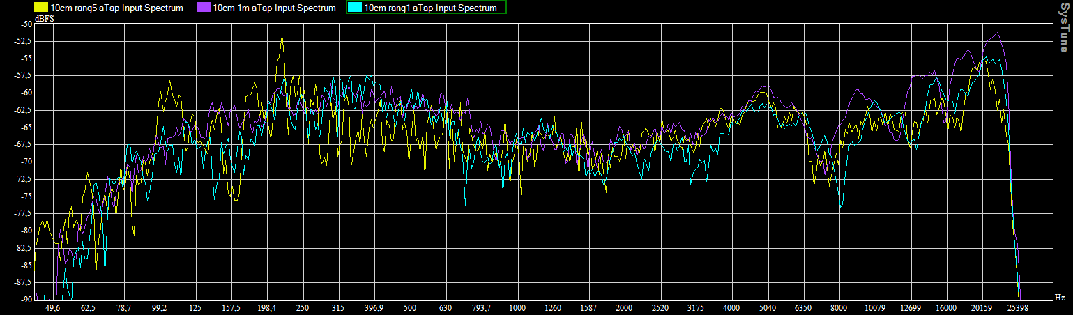 10cm 1mRang1rang5_aTap_spectr 2017-08-28Pleine résolution (1539 × 452) Enceinte posée au sol (axe à 10cm) / Avec tapis / Spectre en fonction de la distance
