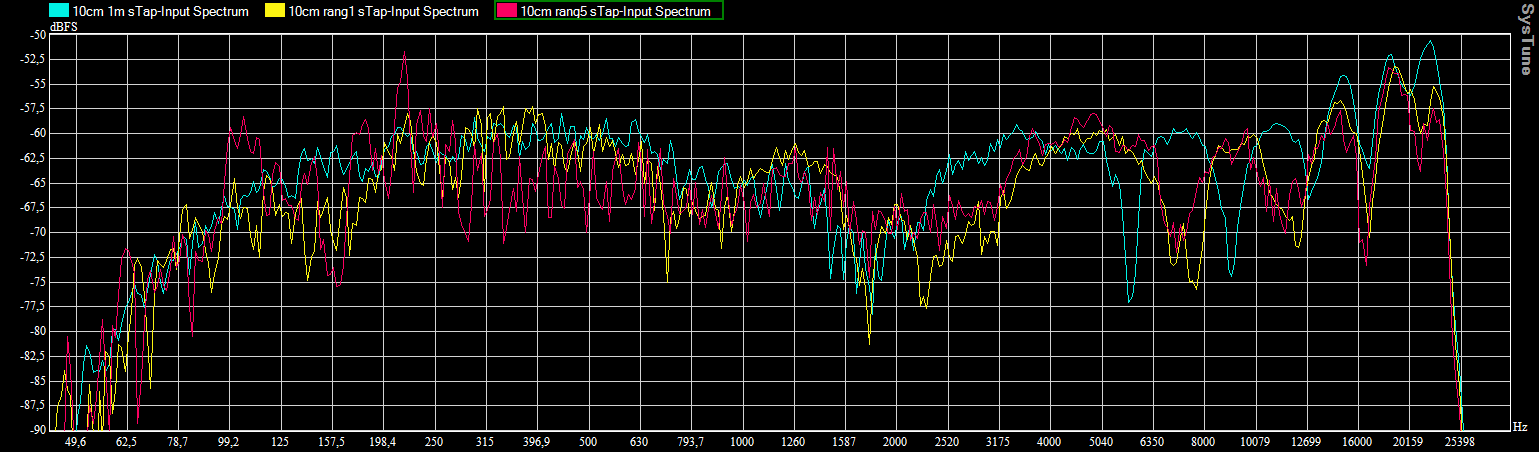 10cm 1mRang1rang5_sTap_spectr 2017-08-28Pleine résolution (1539 × 452) Enceinte posée au sol (axe à 10cm) / Sans tapis / Spectre en fonction de la distance
