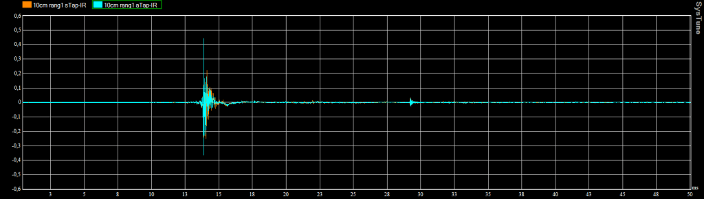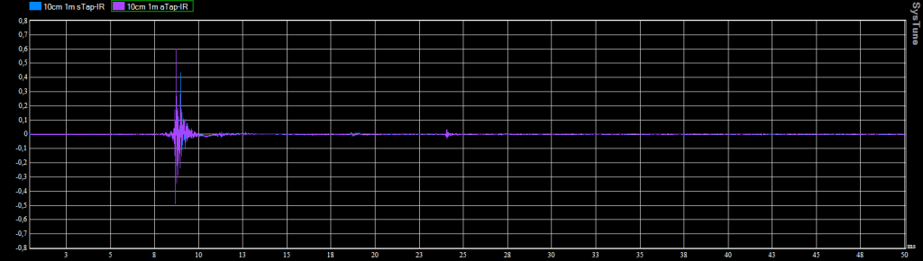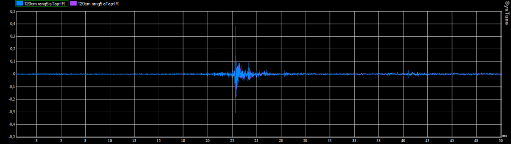 On constate que le tapis absorbe effectivement les premières réflexions au sol. En fonction du placement de l’enceinte dans la salle on trouve aussi des réflexions marquées sur le plafond et les murs latéraux. Nous avons placé des tissus absorbants sur les côtés et le dessus des enceintes pour détecter sur quelle(s) surface(s) les réflexions se produisaient.