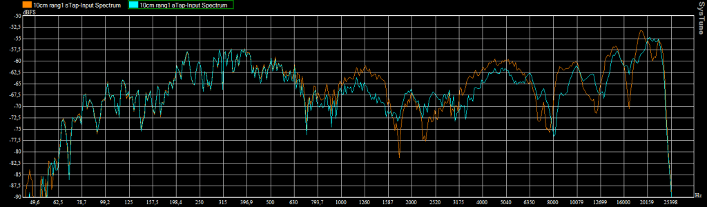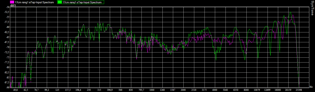 Enceinte légèrement surélevée (axe à 17cm) / Micro au 1er rang / Spectre avec et sans le tapis