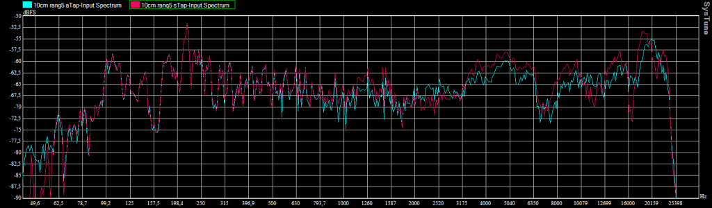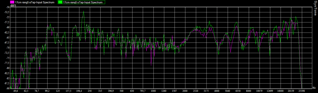 Enceinte légèrement surélevée (axe à 17cm) / Micro au 5e rang / Spectre avec et sans le tapis