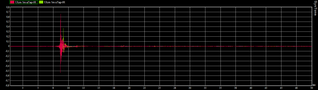 Enceinte légèrement surélevée (axe à 17cm) / Micro au 1er rang / Réponse impulsionnelle avec et sans le tapis