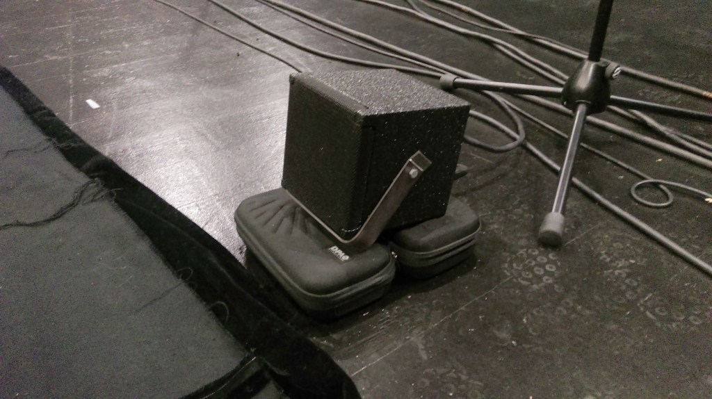 Lors de notre résidence estivale au Théâtre Garonne nous avons eu l’occasion de tester nos « front-fills » sur une scène de plain-pied. Ces enceintes sont coaxiales avec une ouverture de 120°. Lorsque ces enceintes sont posées au sol il y a d’importantes réflexions qui colorent et brouillent le son diffusé.