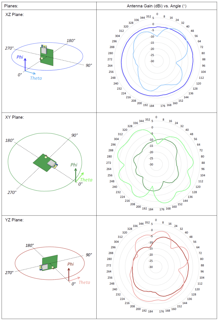 Les Antennes ont un profil d’émission qui dépend de l’orientation des Tags et des Anchors. Dans les polaires suivantes on regarde dans les trois plans perpendiculaires l’influence de l’orientation relative entre un Tag et un Anchor.